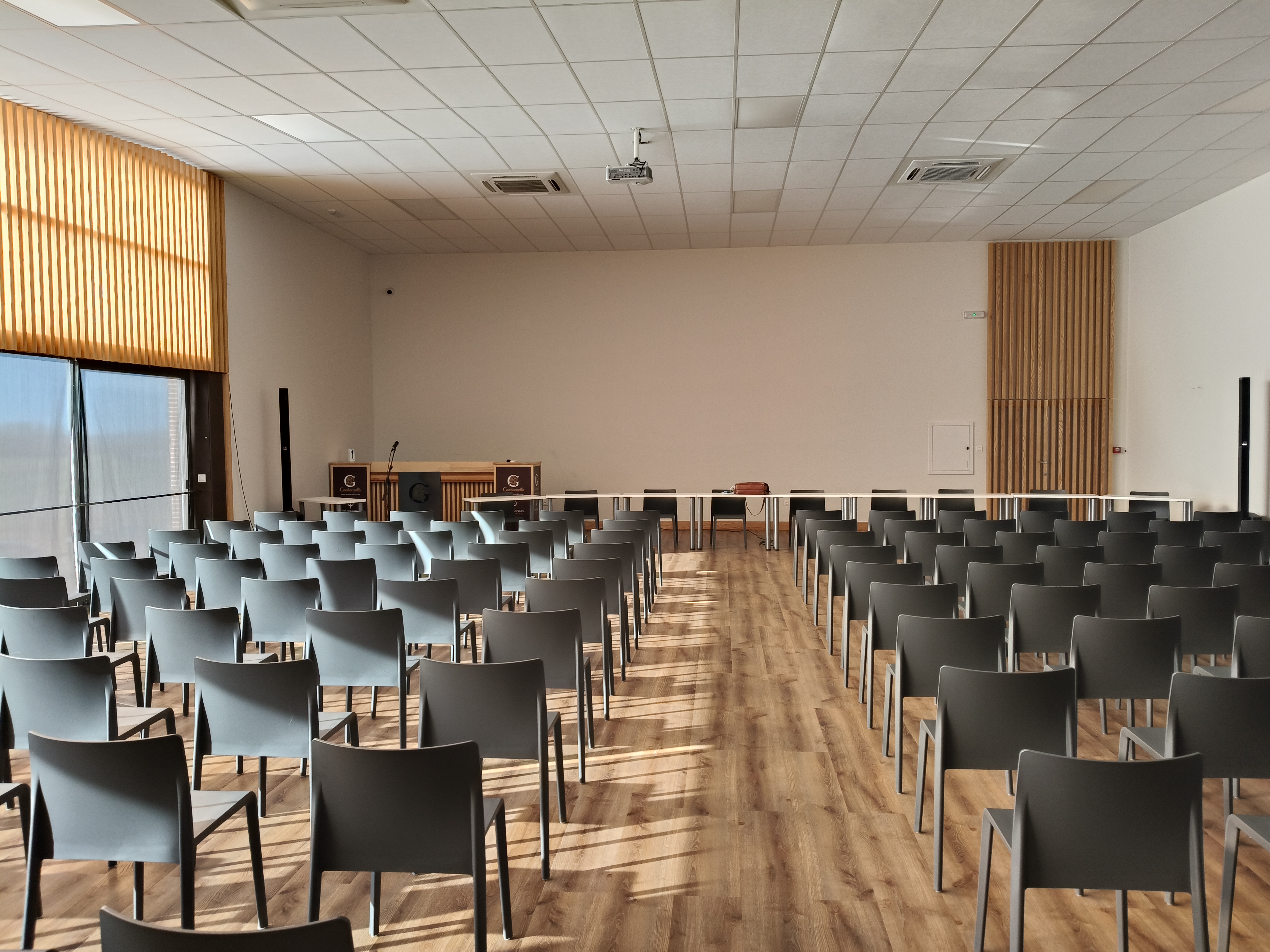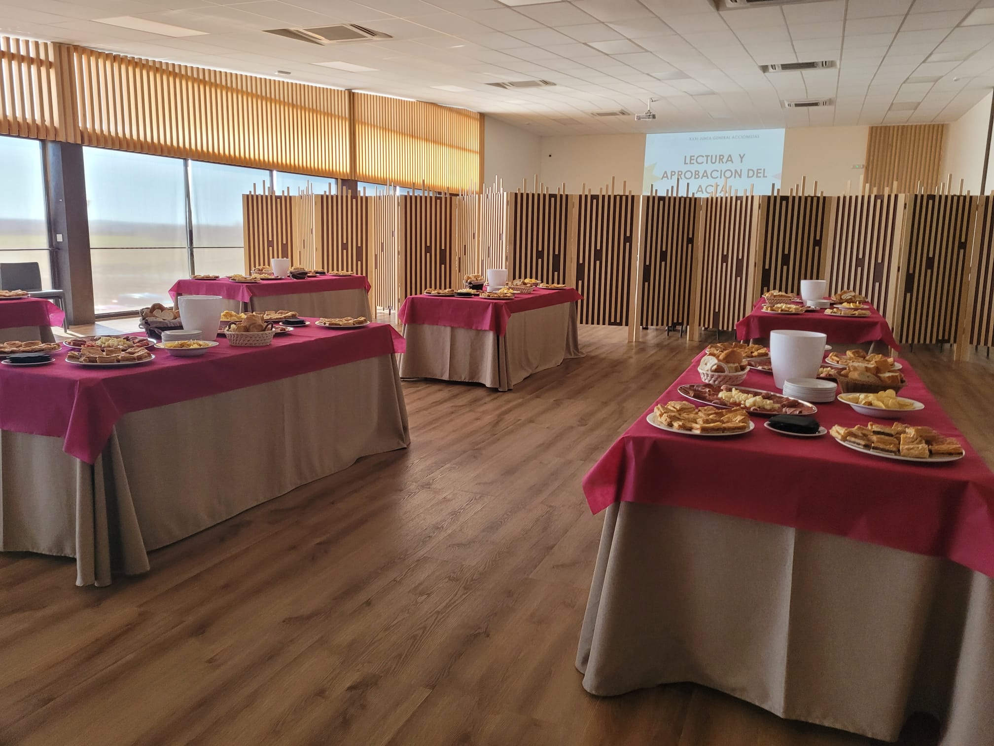 En esta ocasión, se configuró en dos ambientes claramente diferenciados pero conectados entre sí, una mitad preparada con las sillas orientadas para seguir la proyección y el desarrollo de la junta, y otra con mesas dispuestas para compartir posteriormente un pincheo con nuestros vinos en un entorno más distendido.